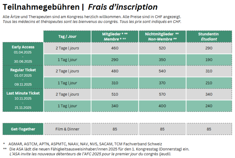 L’ASA offre aux participants qui ont obtenu l’attestation de formation complémentaire « Acupuncture – Médecine chinoise – MTC (ASA) » durant l’année du congrès un billet d’entrée pour le premier jour du congrès (jeudi).